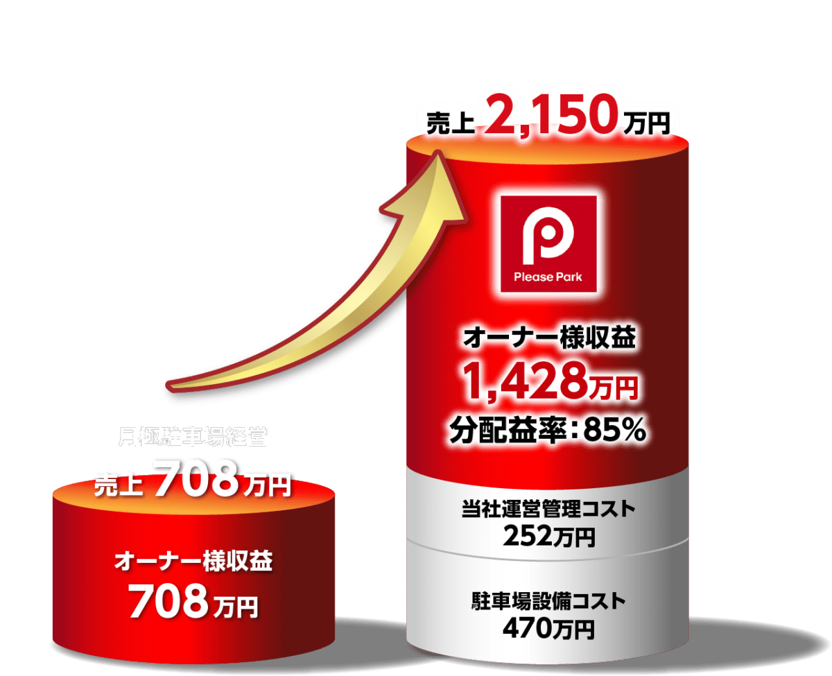 土地オーナー様の土地へ弊社が駐車場設置・運営を行います。毎月の売上(営業利益)から定められた配分額をお支払いするサービスとなります。